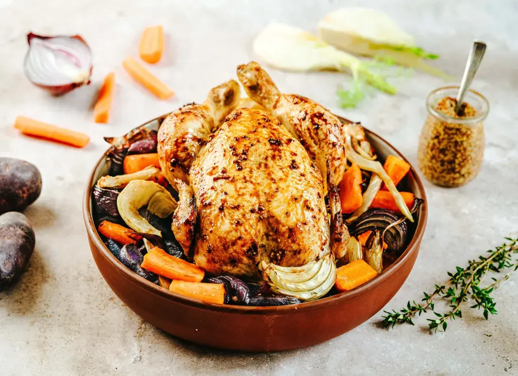Pour un poulet rôti savoureux à partager, placez le dans un plat au four à 180°C. Le temps de cuisson est à adapter en fonction de son poids. Comptez 1h/kg .