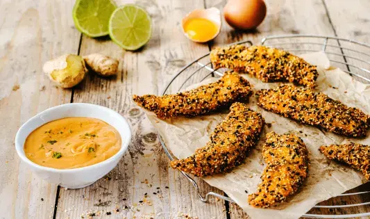 Aiguillettes de poulet panées au sésame, sauce à la cacahuète et au gingembre