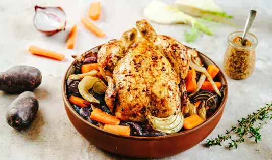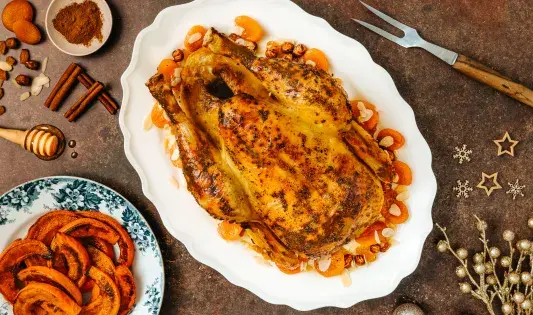Poularde rôtie au cidre, pommes caramélisées et courge butternut glacée au cidre