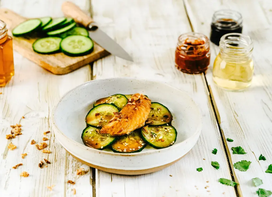 - Ajouter une pointe de pâte de piment rouge (optionnel).Ajouter les rondelles de concombre et bien remuer à l’aide d’une cuillère. Réserver au frais