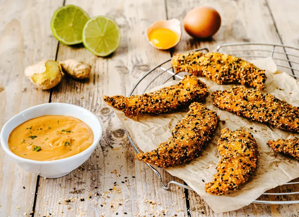 - Enrober les aiguillettes de poulet dans la farine, puis dans l'œuf battu puis dans le mélange chapelure/sésame.
