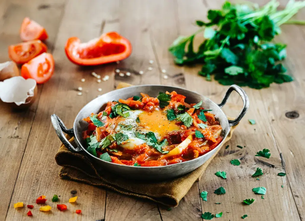 - Faire réchauffer à feu moyen puis faire des petits creux dans la sauce avec le dos d'une cuillère et casser un œuf dans chaque creux. Couvrir la poêle et laisser cuire les œufs jusqu'à ce que les blancs soient pris, mais que les jaunes restent coulants. Servir chaud.