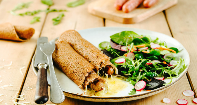 - Dans une poêle sans matière grasse ou à la plancha, faire cuire les saucisses pendant 10 min en les faisant rouler régulièrement. Laisser les saucisses refroidir. Les couper en tronçons de 3 à 4 cm.