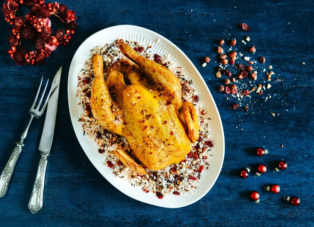 Une poularde généreuse farcie de riz, noisettes croquantes et cranberries acidulées.