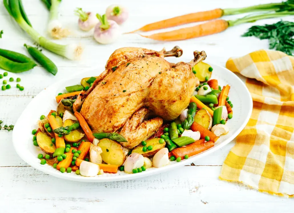 Savourez un Poulet Blanc Fermier tendre accompagné de légumes nouveaux rôtis, pour un repas simple, sain et plein de goût !