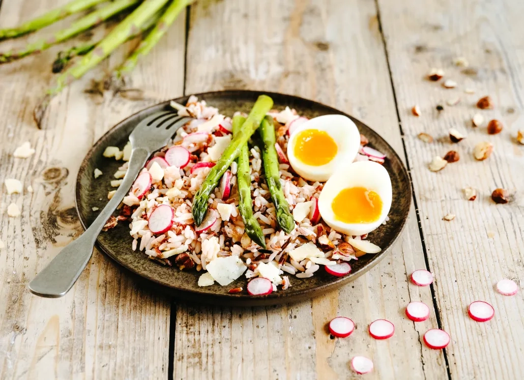 - Dans une petite assiette creuse, disposer le riz, les asperges et l'œuf mollet délicatement. Saupoudrer de noisettes et de copeaux de parmesan puis verser la vinaigrette au moment de la dégustation.