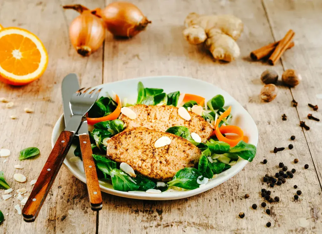 - Pendant ce temps dresser les assiettes avec la mâche, quelques lamelles de carottes et des amandes effilées.
