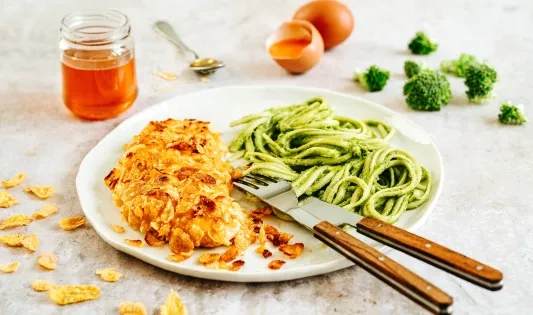 Escalopes de dinde crunchy au miel et linguine aux brocolis