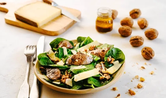 Salade aux foies de lapin, pousses d’épinard, comté et noix