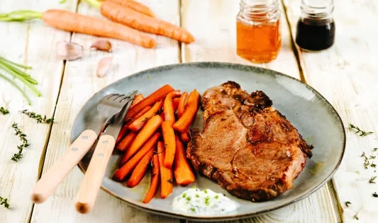 Côtes de porc échine grillées au miel et carottes glacées