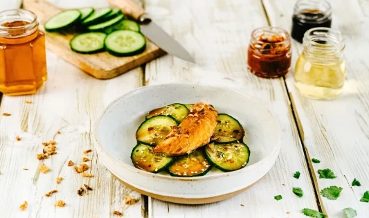 Aiguillettes de poulet au miel et au sésame, salade de concombre