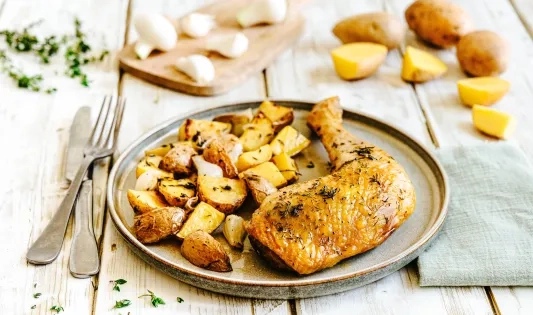 Cuisses de poulet au four et pommes de terre au thym