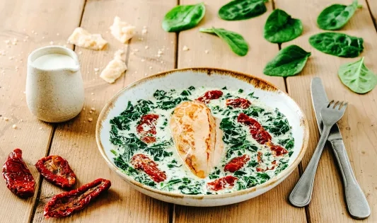 Poulet onctueux aux épinards et aux tomates confites