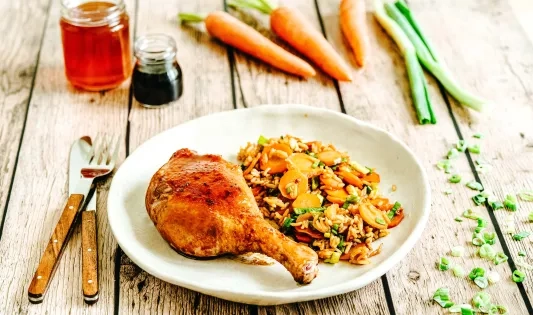 Cuisses de canard au miel et soja, riz aux carottes et cébette