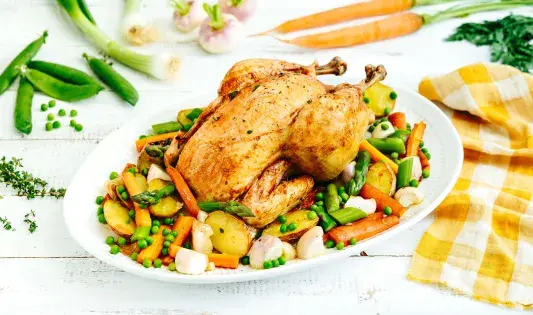 Poulet blanc fermier et légumes nouveaux rôtis au four