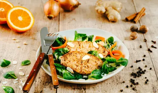 Salade aux tranches fines de porc marinées aux quatre-épices, vinaigrette à l’orange