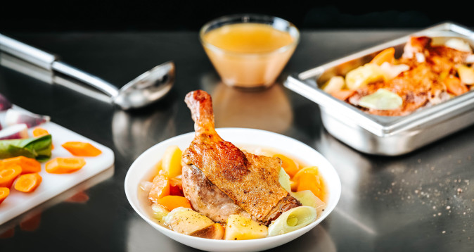 Dans une sauteuse, saisir les cuisses de canard à feu vif côté peau en premier, dans un peu de matière grasse pendant quelques minutes. Après coloration, placer les cuisses de canard dans un bac gastronome, recouvrir de sauce, fonds, jus de votre choix, couvrir et cuire au four 30 à 40 min à 180°c chaleur tournante.