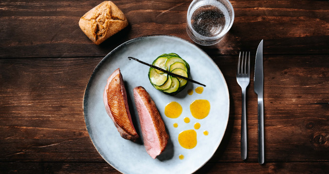Placer le filet de canard, incisés côté peau, sur les grilles du four recouvertes de papier cuisson. Saler, poivrer cuire à 180°C, chaleur tournante pendant 25min. Les placer côté peau vers le haut afin de nourrir la chaire de gras pendant la cuisson.