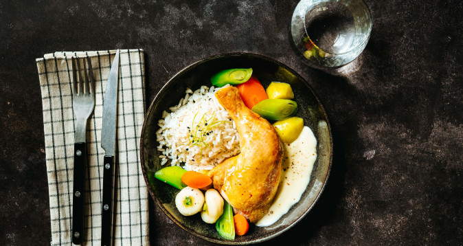 Astuce du chef : Cuire la volaille dans un bouillon parfumé selon votre goût avec carottes, oignons, navets, clou de girofle, poireaux.