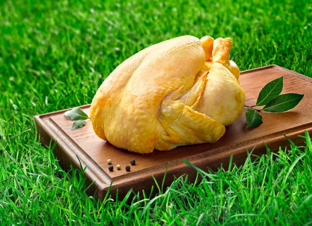 Bien élevés et bien nourris, nos poulets bénéficient d'une alimentation diversifiée selon le cahier des charges Bleu-Blanc-Cœur qui garantie une viande de qualité tout en favorisant la biodiversité des cultures dans les champs