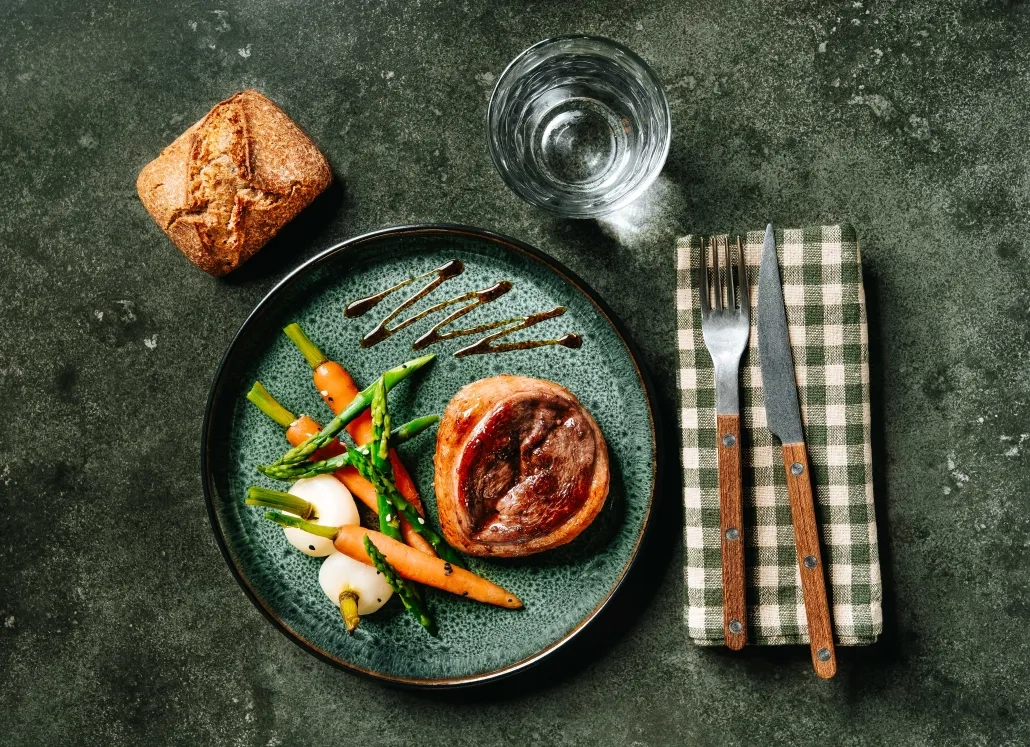 Un tournedos de canard laqué au poivre de Sichuan, sublimé par des mini‑légumes glacés pour une assiette tout en délicatesse.